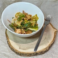 Филе куриное, огурцы, салат Айсберг, салат Романо, фасоль, лук красный, заправка Ореховая